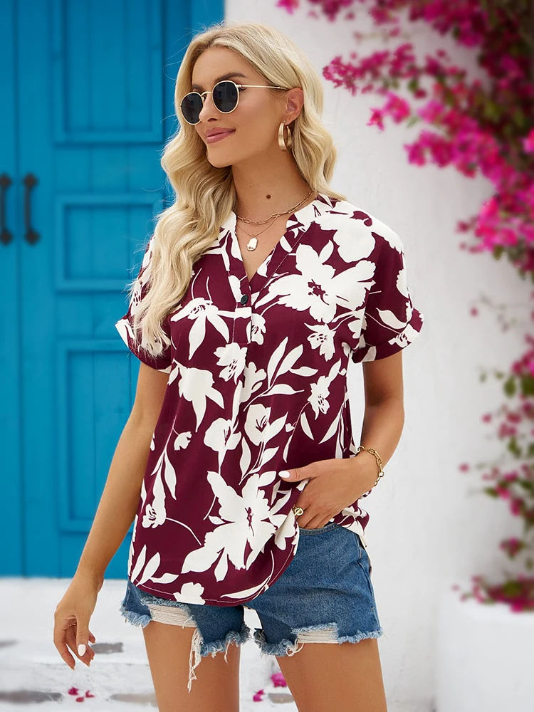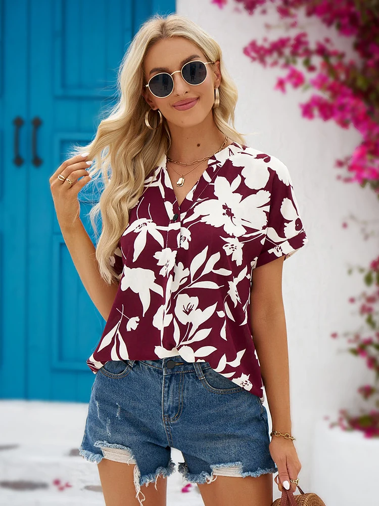 Print Flowers Casual Blouses V-Neck T-Shirts & Blouses Women's Clothes Color: Burgundy Size: S|M|L|XL|XXL